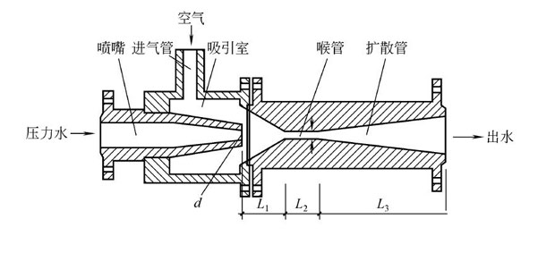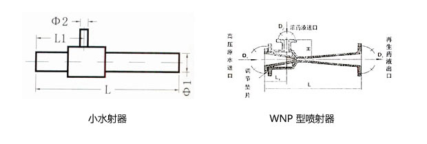 水射器原理 高壓原水通過管道閥門進入噴射器的漸縮段,將靜壓頭轉(zhuǎn)換成動能,在噴嘴處成為高速射流,使混合室形成微真空狀態(tài),將高濃度的再生藥液吸入混合室,并使再生藥液的壓力和速度發(fā)生變化;在混合段內(nèi),水和藥液得到充分地混合,然后注經(jīng)擴散段,使再生液減低流速,靜壓頭升高,再通過出口管道及閥門將稀再生液送到交換器本體中。