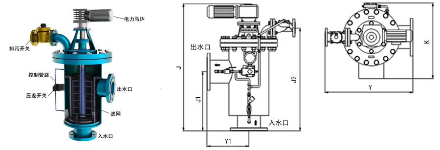 型號(hào) 管徑 J J1 J2 Y Y1 K 出入水口 重量 濾網(wǎng)面積 處理水量